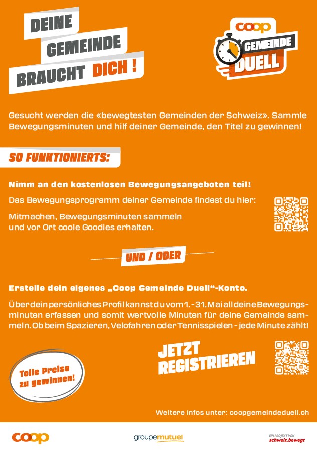 Vom 1. bis 31. Mai wird ganz Emmetten zur Bewegungszone. Über das ganze Dorf verteilt finden zahlreiche Aktivitäten statt, organisiert von Vereinen, Schule, Gemeinde, Kirche, Gewerbe und engagierten Privatpersonen. Ob Spaziergang, Weidepflege auf der Alp, Wanderung, Velotour oder spielerische Bewegung – jede Minute zählt und fliesst in das gemeinsame Ziel ein: möglichst viele Bewegungsminuten für unser Dorf zu sammeln. Weitere Informationen findest Du hier. (im unteren Teil der Seite im Emmetter Eventkalender unter Monat Mai 2026)