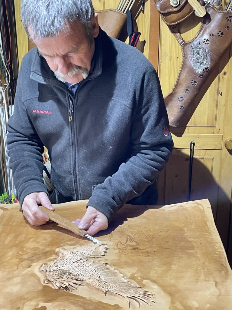Mike Zimmermann entführt mit Lederkunst in eine Welt voller Details. Mit geschickten Händen formt er Eulen, Landschaften und Portraits, die fast lebendig wirken. Jedes Werk erzählt eine Geschichte, jedes Lederstück ist ein Unikat – und in seinen 3D-Bildern wird die Kunst zum greifbaren Erlebnis.