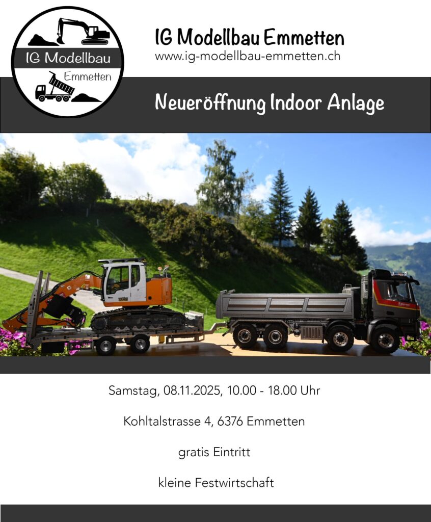 Jetzt lädt Walti Rogenmoser alle ein, einen Blick in seine Welt zu werfen: Am Samstag, 8. November 2025, wird die Indoor-Anlage eröffnet. Jeder ist willkommen! Staunen, lachen, staubige Mini-Baustellen erleben – und vielleicht ein Stück Kindheitsträume wiederentdecken. Für das leibliche Wohl ist mit einer kleinen Festwirtschaft gesorgt. Tauchen Sie ein in die Welt, in der Träume und Technik aufeinandertreffen – im Maßstab 1:14.