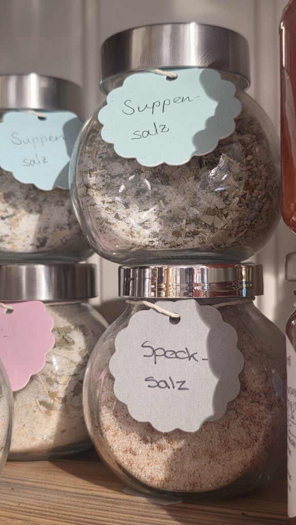 Weitere Gaumenfreuden bereiten ihre verschiedenen Salze. Die auserlesene Auswahl vom Berg&Tal-Salz bis zum Güggeli-Salz lässt jedes Gourmet-Herz schneller schlagen. Die Kräuter und Blumen für ihre Erzeugnisse pflanzt sie grösstenteils in ihrem Garten im Boden 1 und trocknet sie für die weitere Verarbeitung. „Ich bin glücklich, dass ich seit März 2021 hier in Emmetten wohnen darf.“, meint Helen, „Hier habe ich meine Heimat gefunden und kann mich vollkommen auf meine Kräuter-Leidenschaft konzentrieren.“