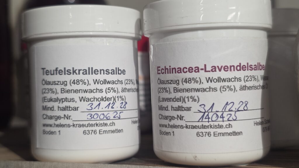 Das Interesse an Kräuterkunde erwachte, als sie mit 15 Jahren einen Zeckenbiss erlitt und es Helen nach der Zeckenentfernung gesundheitlich immer schlechter ging. Die Beschwerden zeigten sich vorwiegend mit motorischen Einschränkungen und einer konstanten Müdigkeit. Sie konsultierte den Zeckenspezialist Dr. med. Norbert Satz in Zürich, der ihr Borreliose diagnostizierte. Dies wiederum veranlasste Helen, sich mit der Kräuterkunde näher zu beschäftigen und fing an, selbst Salben herzustellen. Irgendwann reifte in ihr der Wunsch, eine 3-jährige Ausbildung zur Homöopathin in Angriff zu nehmen, die sie auch mit Erfolg abschloss. Seither sind 10 Jahre vergangen und sie produziert in ihrer Küche in Emmetten Salben aus Ringelblumen, Teufelskrallen oder Echinacea mit Lavendel. „Sollte jemand einen Rat für ein gesundheitliches Problem brauchen, der kann sich gerne bei mir melden.“, erklärt Helen.