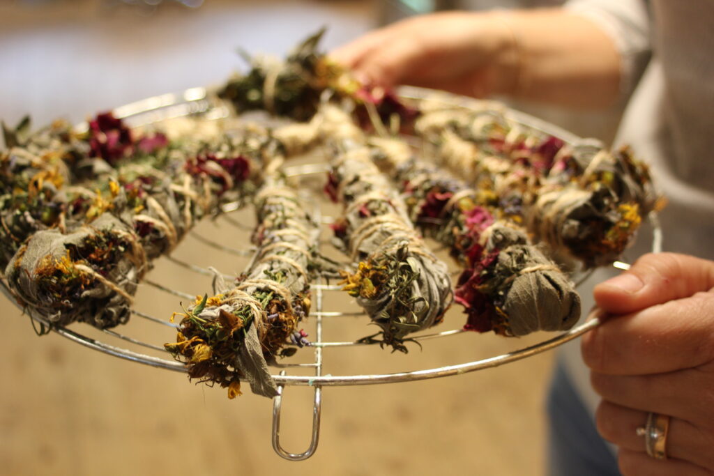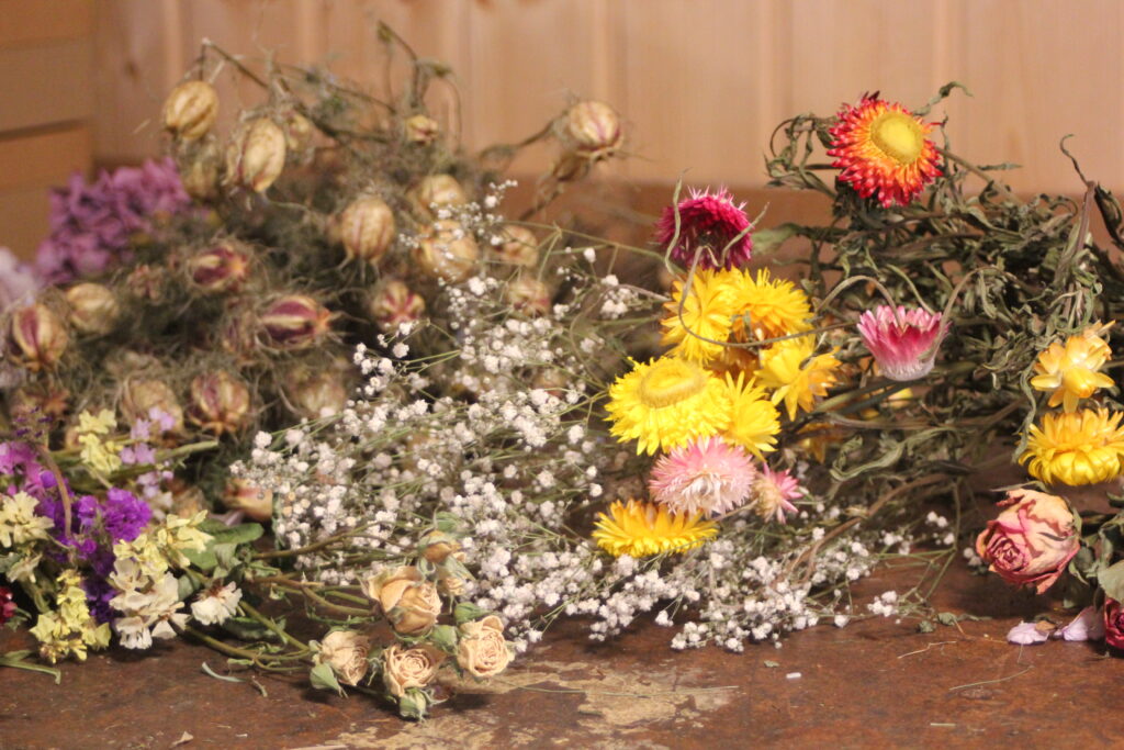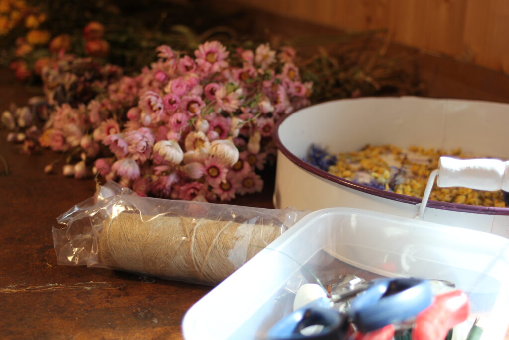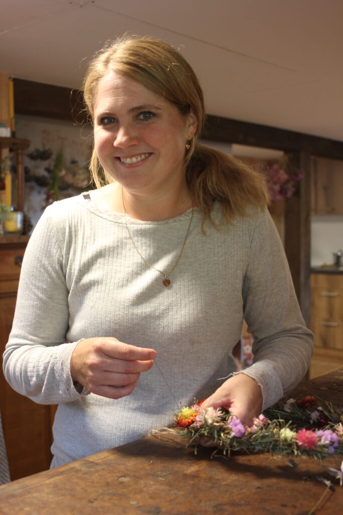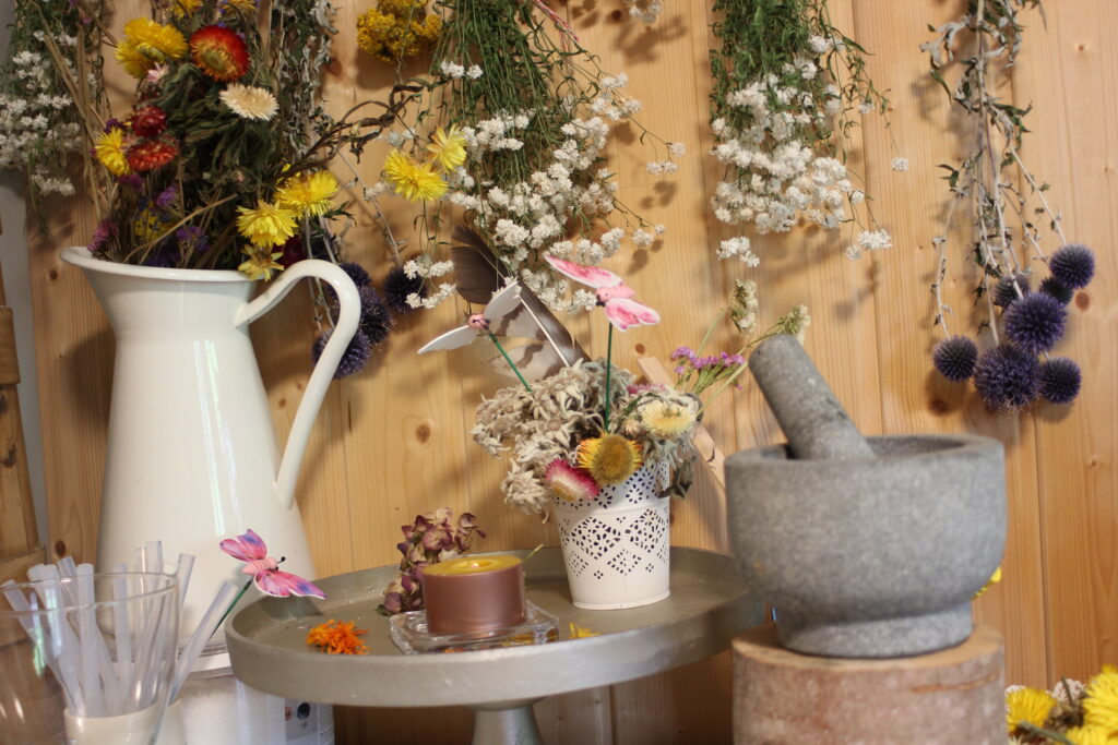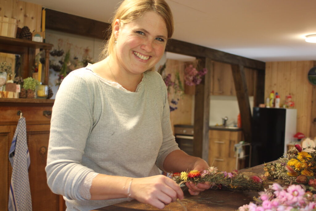 Im Dachgeschoss des kleinen Stalls neben dem Wohnhaus, hat sich Lisa eine kleine Duft-Oase eingerichtet, wo sie ihrer Leidenschaft nachgehen kann. Bereits beim Öffnen der Türe strömt ein blumiger Duft in die Nase und man betritt den Raum mit einer gewissen Vorfreude. Überall an den Wänden hängen zum Trocknen bunte Blumen oder liegen auf ihrem Arbeitstisch parat für ihre Blumenkreationen. Lisas Kränze sind wunderschöne, zeitlose Dekorationselemente, die mit einer Vielzahlt getrockneter Blumen aus ihrem eigenen Garten gestaltet werden. Sie strahlen eine natürliche Schönheit aus und bringen den Charme der Natur in dein Zuhause. „Die Liebe zu den Blumen habe ich von meiner Großmutter geerbt. Sie hat mir gezeigt, dass die kleinsten Dinge im Leben die größten Freuden bereiten können.“, meint Lisa mit einem Lächeln und ergänzt, „Seit neuestem kreiere ich auch Räucherbündel, die mit sorgfältig ausgewählten Kräutern und Blüten gefüllt sind. Sie bringen natürliche Düfte in dein Zuhause und schaffen eine wohlige Atmosphäre – ideal für Meditation, Entspannung oder einfach nur, um die Sinne zu verwöhnen.“