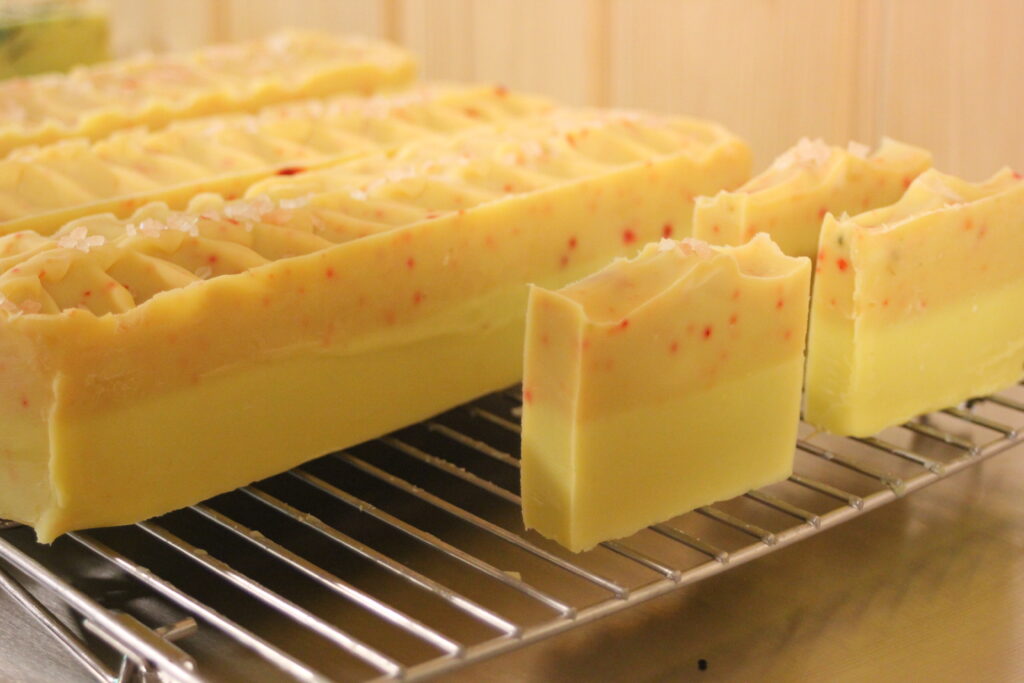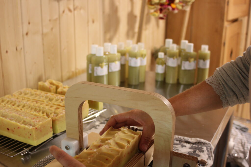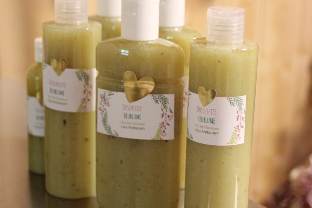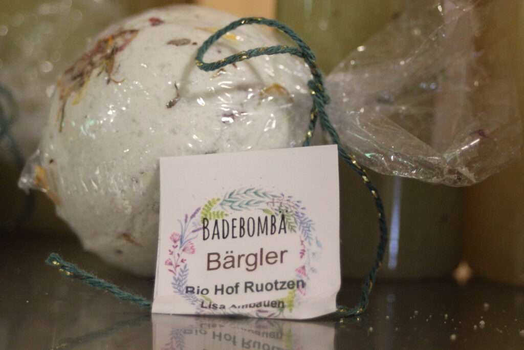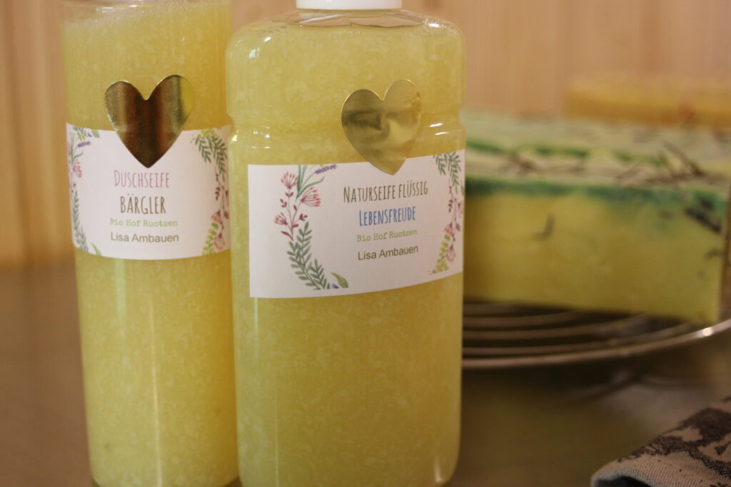 Etwas ganz Besonderes sind auch ihre Naturseifen, die sie mit viel Liebe und Sorgfalt aus rein biologischen Zutaten herstellt. Sie duften nicht nur betörend, sondern sind auch ein wunderschönes Natur-Geschenk für deine Haut. Vor ca. 10 Jahren war Lisa auf der Suche nach einer Produktidee, die sie auf dem Bio-Hof verkaufen konnte. „Ich wollte etwas Besonders, das nicht jeder macht. Die Kombination aus einzigartigen Produkten und meiner Liebe zur Natur hat mich schließlich zum Seifensieden geführt.“ Und so besuchte Lisa einen Seifensieder-Kurs in Bern, um von den Profis zu lernen. Seither experimentiert sie fast täglich und tüftelt an neuen Formen, Strukturen sowie harmonischen Düften und Zusammensetzungen. Dabei sind kreative Naturseifen herausgekommen, die beinahe zu schade sind, sie zu benutzen und in all ihren Produkten kommt das kreative Auge der gelernten Malerin zum Vorschein. So wird jede Seife zu einem kleinen Kunstwerk für alle Sinne. „Am Dorfmärcht bringe ich, nebst den Badebomben, meine neueste Kreation mit“, erzählt Lisa, „Flüssigseifen mit den wohlklingenden Namen wie Bärgler, Wildbluämä, Heublume oder Lebensfreude.“